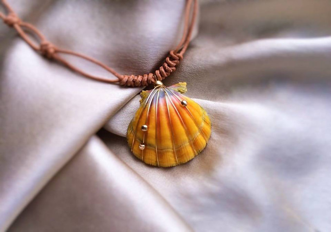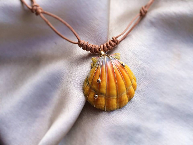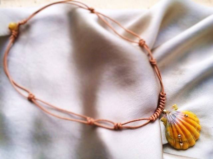 革紐と組み合わせたサンライズシェル・ペンダント